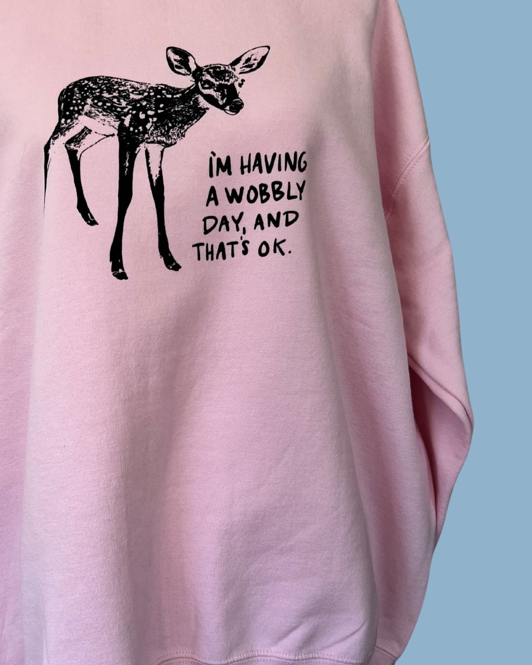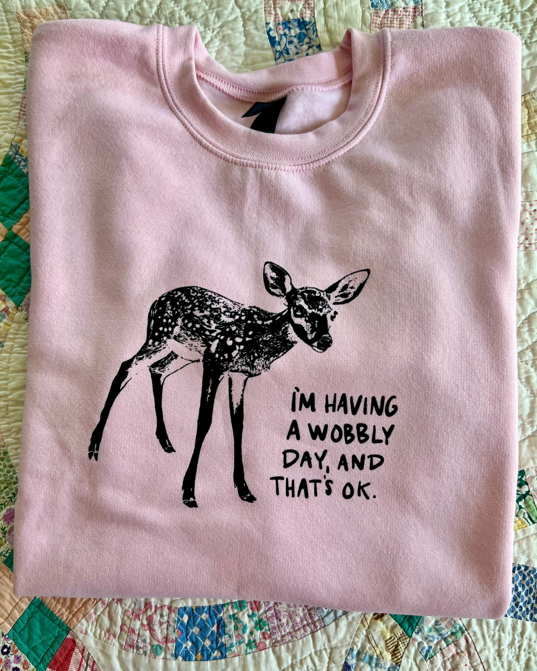 This Wobbly Day Deer is part of our new Handmade Collection: each piece features our own original hand-drawn art and lettering, and printed by hand in our home studio, using stencils, stamps and screens. Printed on Gildan heavyweight sweatshirts in a Light Pink.